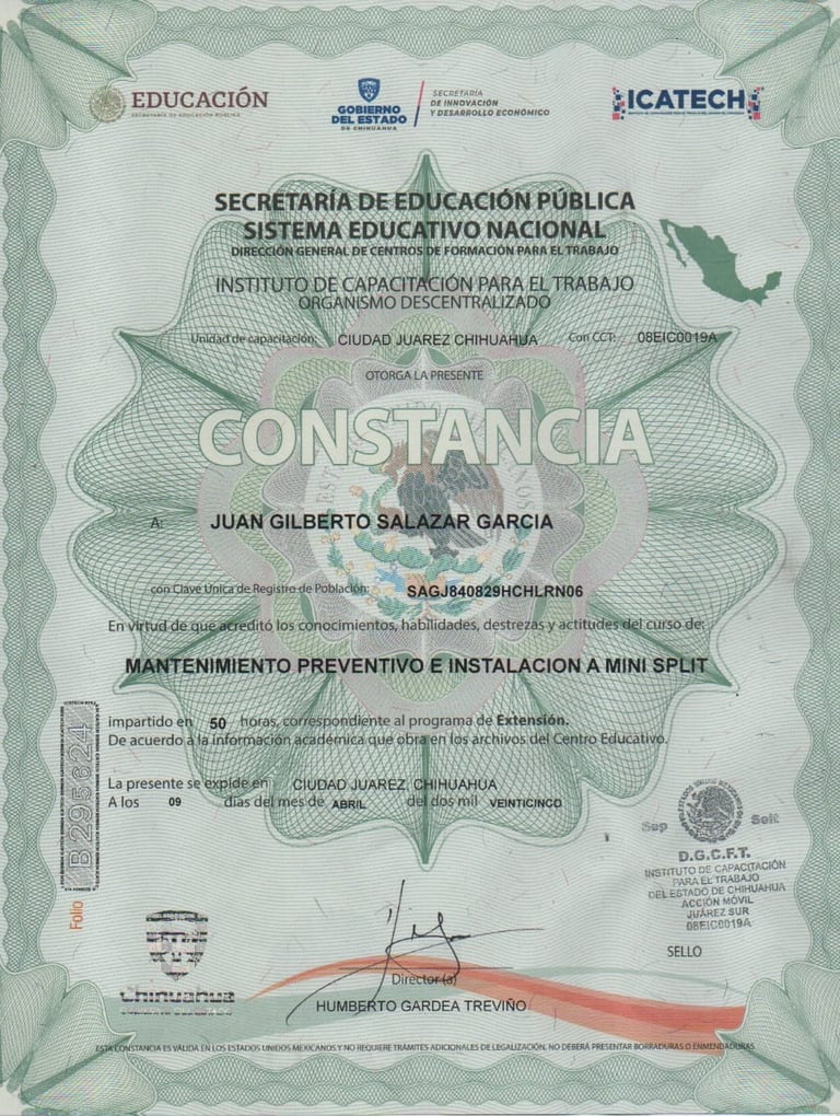 Respaldamos nuestro trabajo con capacitación constante y certificaciones oficiales. Hemos recibido entrenamiento especializado de Universidad Mirage, cursos técnicos con Frikko, capacitaciones HVAC y programas de formación de la Fundación Carlos Slim. Esta preparación nos permite ofrecer un servicio profesional, actualizado y de calidad en cada instalación y reparación.