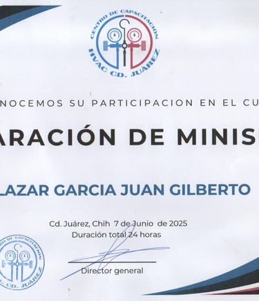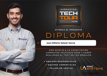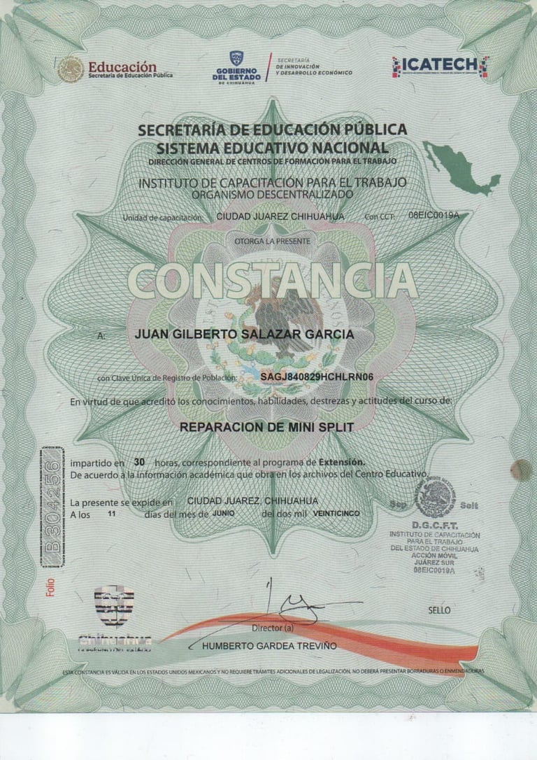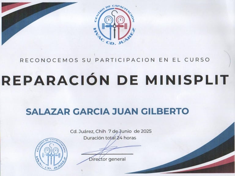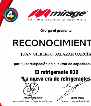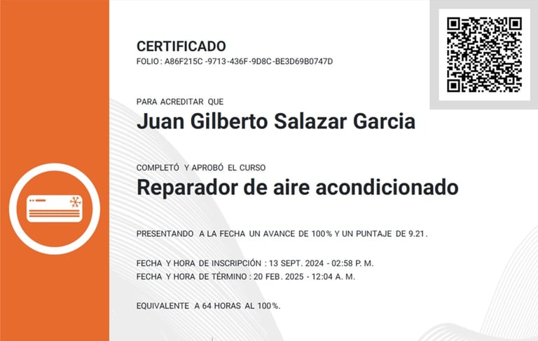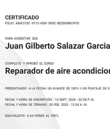 Respaldamos nuestro trabajo con capacitación constante y certificaciones oficiales. Hemos recibido entrenamiento especializado de Universidad Mirage, cursos técnicos con Frikko, capacitaciones HVAC y programas de formación de la Fundación Carlos Slim. Esta preparación nos permite ofrecer un servicio profesional, actualizado y de calidad en cada instalación y reparación.