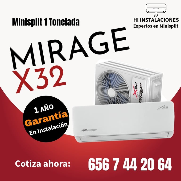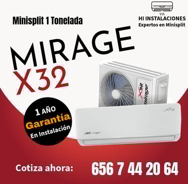 El Mirage X32 es un equipo tipo minisplit con tecnología inverter que utiliza el refrigerante ecológico R32 de última generación, ofreciendo mayor eficiencia y menor impacto ambiental . Disponible en capacidades de 1, 1.5 y 2 toneladas, con opciones de voltaje 110V y 220V, y versiones solo frío o frío/calor